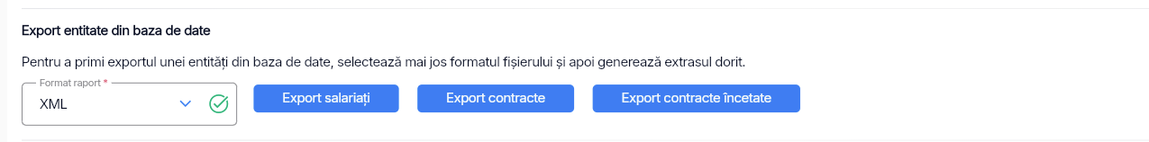 - tot în pagina REGES – Setări – Angajator – Utile, după generarea credențialelor, apăsați butonul “Export contracte”, dar nu înainte de a vă asigura că formatul pentru export este XML